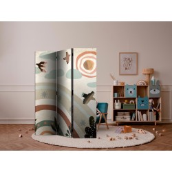 Spanische Wand Die spanische Wand kann sowohl im Wohnzimmer, Schlafzimmer, Kinderzimmer, Badezimmer als auch in der Küche aufgestellt werden. Viele Büro-, Restaurant- und Clubbesitzer entscheiden sich häufig für diese dekorative Lösung in ihren Räumlichkeiten. Die spanische Wand "Paravent - Sun Above the Rainbow - Birds in Subdued Colors Flying Among Clouds Above a Rainbow and Vegetation on a Light Beige Background" ist aus geruchsneutralen Materialien hergestellt, die sicher sind und daher keine Allergien auslösen. Es ist eine vielseitige Dekorationsmöglichkeit, die viele Vorteile hat. Der Hauptvorteil ist, dass diese Dekoration leicht zu bewegen ist, so dass sie schnell und einfach neu positioniert werden kann. Wichtig ist, dass die inneren Trennwände einen UV-Schutz haben, so dass die Farben auch im Laufe der Jahre intensiv bleiben. Der Raumteiler hat Designs, die die Einrichtung jedes Raumes ergänzen können.