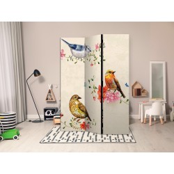 Raumteiler Paravent "Paravent - Bird Song" können Sie Räume in Zonen aufteilen – das Schlafzimmer in Schlaf- und Garderobenbereiche, das Wohnzimmer in Sitz- und Essbereiche. Gestalten Sie Ihre Home-Office-Ecke und grenzen Sie den Bürobereich im Wohnzimmer mit einem stilvollen