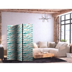 Paravent "Paravent - Fish Leaping Above the Waves - Oriental Fish and Water Lilies Among High Waves in Sea Green Colors" Paravents sind hervorragende Dekorationselemente, die auf vielfältige Weise eingesetzt werden können. Sie verbinden perfekt Funktionalität und originelle Ästhetik. Aus diesem Grund sind sie sehr beliebt. Der Hauptvorteil ist, dass diese Dekoration einen Raum unterteilen kann, ohne dass Renovierungsarbeiten erforderlich sind. Im Folgenden finden Sie die Vorteile dieses Gestaltungselements – lassen Sie sich davon für Ihre Einrichtung inspirieren. Sie können die Paravents aus unserem Sortiment in drei Varianten kaufen, und jede von ihnen erfüllt eine interessante Funktion: Paravent – einseitig bedruckt, Paravent – doppelseitig bedruckt, Akustischer Paravent. Dies ist ein klarer Beweis dafür, dass die Trennwände auch sehr nützlich sind. Viele Menschen verwenden sie zum Beispiel, um einen Raum optisch zu unterteilen oder einen Teil davon zu verbergen. Der Raumtrenner ist auch häufig in Wirtschaftsräumen zu finden, zum Beispiel in einem Friseursalon, einem Boutique oder einer Arztpraxis. Jeder schätzt die Ästhetik und den praktischen Nutzen dieser Dekoration. Mit Raumteiler Paravent "Paravent - Fish Leaping Above the Waves - Oriental Fish and Water Lilies Among High Waves in Sea Green Colors" können Sie Räume in Zonen aufteilen – das Schlafzimmer in Schlaf- und Garderobenbereiche, das Wohnzimmer in Sitz- und Essbereiche. Gestalten Sie Ihre Home-Office-Ecke und grenzen Sie den Bürobereich im Wohnzimmer mit einem stilvollen Raumteiler ab. Wie Sie es verwenden, hängt von Ihrer Phantasie, Ihren Bedürfnissen und Vorlieben ab.