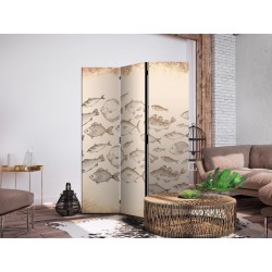 Paravent "Paravent - Sketch of a Fish School - Sketches of Various Fish Species Swimming in a School on a Beige Background in Vintage Style"Paravents sind hervorragende Dekorationselemente, die auf vielfältige Weise eingesetzt werden...