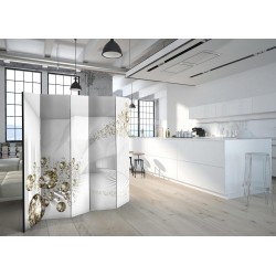 Raumteiler Paravent Unsere Raumteiler Paravents haben viele Vorteile. Zunächst einmal gibt es sie in verschiedenen Varianten, d.h. sie können aus drei oder fünf Teilen bestehen. Dank der Metallscharniere lässt sich diese Dekoration leicht zusammenfalten. Die Raumteiler stehen auf einem Sockel, der auch vor Beschädigungen schützt. Dieses dekorative Element besteht aus einer soliden Holzkonstruktion. Das Satinband sorgt für einen eleganten Abschluss und verstärkt die Seiten. Unsere Raumteiler sind aus Vliesstoff gefertigt, haben also eine feine Struktur und sind frei von sichtbaren Heftklammern. Es wurde auf jedes noch so kleine Detail geachtet, so dass diese Dekoration auch durch ihre Eleganz besticht. Wir haben hier also Funktionalität, Ästhetik und Eleganz – was will man mehr von einer Dekoration?Technische Details