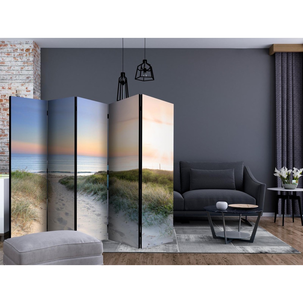 Raumteiler Paravent "Paravent - Morning walk on the beach II" können Sie Räume in Zonen aufteilen – das Schlafzimmer in Schlaf- und Garderobenbereiche, das Wohnzimmer in Sitz- und Essbereiche. Gestalten Sie Ihre Home-Office-Ecke und grenzen Sie den Bürobereich im Wohnzimmer mit einem stilvollen