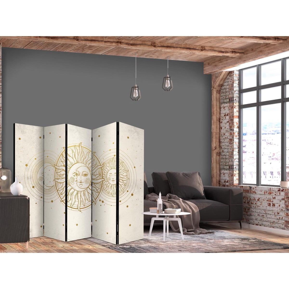 Spanische Wand Die spanische Wand kann sowohl im Wohnzimmer, Schlafzimmer, Kinderzimmer, Badezimmer als auch in der Küche aufgestellt werden. Viele Büro-, Restaurant- und Clubbesitzer entscheiden sich häufig für diese dekorative Lösung in ihren Räumlichkeiten. Die spanische Wand "Paravent - Golden Sun and Moon - Artistic Retro Style Illustration" ist aus geruchsneutralen Materialien hergestellt, die sicher sind und daher keine Allergien auslösen. Es ist eine vielseitige Dekorationsmöglichkeit, die viele Vorteile hat. Der Hauptvorteil ist, dass diese Dekoration leicht zu bewegen ist, so dass sie schnell und einfach neu positioniert werden kann. Wichtig ist, dass die inneren Trennwände einen UV-Schutz haben, so dass die Farben auch im Laufe der Jahre intensiv bleiben. Der Raumteiler hat Designs, die die Einrichtung jedes Raumes ergänzen können.