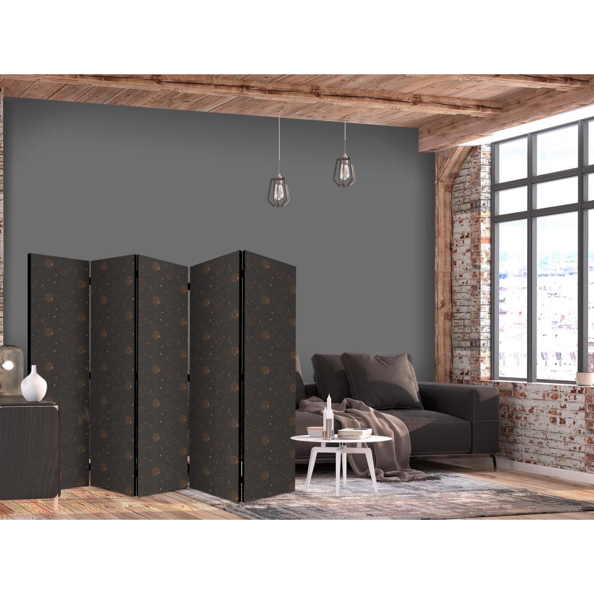 Spanische Wand Die spanische Wand kann sowohl im Wohnzimmer, Schlafzimmer, Kinderzimmer, Badezimmer als auch in der Küche aufgestellt werden. Viele Büro-, Restaurant- und Clubbesitzer entscheiden sich häufig für diese dekorative Lösung in ihren Räumlichkeiten. Die spanische Wand "Paravent - Night Sky - Artistic Composition of Suns and Planets on a Black Background" ist aus geruchsneutralen Materialien hergestellt, die sicher sind und daher keine Allergien auslösen. Es ist eine vielseitige Dekorationsmöglichkeit, die viele Vorteile hat. Der Hauptvorteil ist, dass diese Dekoration leicht zu bewegen ist, so dass sie schnell und einfach neu positioniert werden kann. Wichtig ist, dass die inneren Trennwände einen UV-Schutz haben, so dass die Farben auch im Laufe der Jahre intensiv bleiben. Der Raumteiler hat Designs, die die Einrichtung jedes Raumes ergänzen können.
