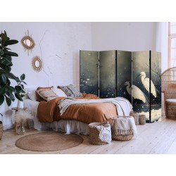 Paravent "Paravent - Herons over a winter pond - Japanese-style illustration in dark colours" Paravents sind hervorragende Dekorationselemente, die auf vielfältige Weise eingesetzt werden können. Sie verbinden perfekt Funktionalität und originelle Ästhetik. Aus diesem Grund sind sie sehr beliebt. Der Hauptvorteil ist, dass diese Dekoration einen Raum unterteilen kann, ohne dass Renovierungsarbeiten erforderlich sind. Im Folgenden finden Sie die Vorteile dieses Gestaltungselements – lassen Sie sich davon für Ihre Einrichtung inspirieren. Sie können die Paravents aus unserem Sortiment in drei Varianten kaufen, und jede von ihnen erfüllt eine interessante Funktion: Paravent – einseitig bedruckt, Paravent – doppelseitig bedruckt, Akustischer Paravent. Dies ist ein klarer Beweis dafür, dass die Trennwände auch sehr nützlich sind. Viele Menschen verwenden sie zum Beispiel, um einen Raum optisch zu unterteilen oder einen Teil davon zu verbergen. Der Raumtrenner ist auch häufig in Wirtschaftsräumen zu finden, zum Beispiel in einem Friseursalon, einem Boutique oder einer Arztpraxis. Jeder schätzt die Ästhetik und den praktischen Nutzen dieser Dekoration. Mit Raumteiler Paravent "Paravent - Herons over a winter pond - Japanese-style illustration in dark colours" können Sie Räume in Zonen aufteilen – das Schlafzimmer in Schlaf- und Garderobenbereiche, das Wohnzimmer in Sitz- und Essbereiche. Gestalten Sie Ihre Home-Office-Ecke und grenzen Sie den Bürobereich im Wohnzimmer mit einem stilvollen Raumteiler ab. Wie Sie es verwenden, hängt von Ihrer Phantasie, Ihren Bedürfnissen und Vorlieben ab.