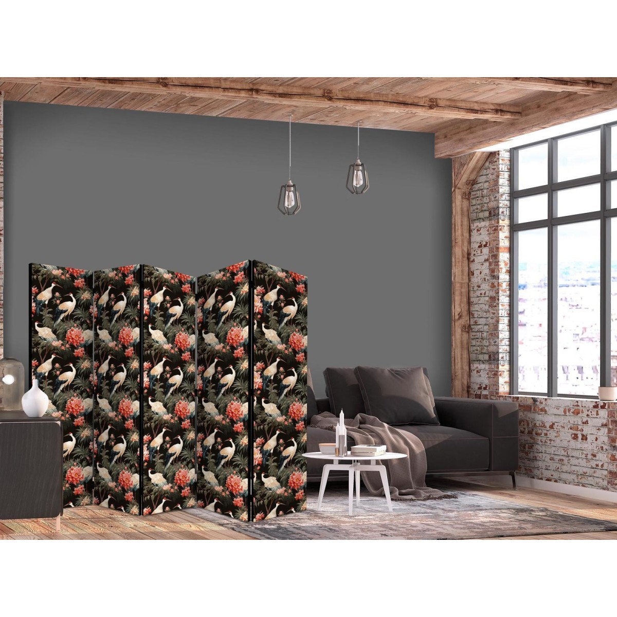 Paravent - Ornament with birds - silhouettes of cranes and peony flowers on a dark background