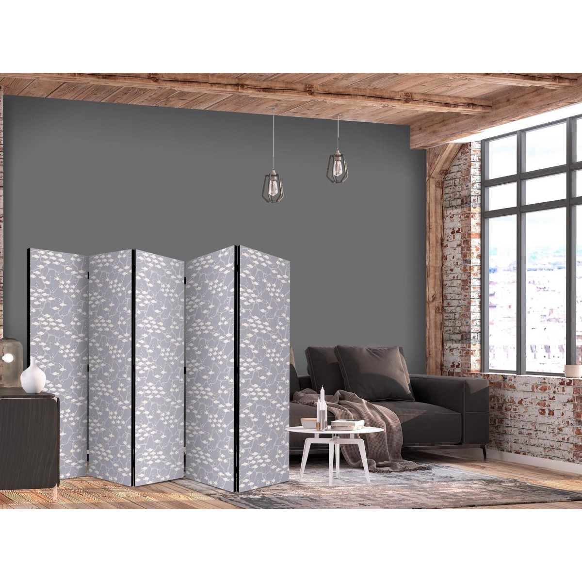 Raumteiler Paravent "Paravent - Underwater School of Small Fish - Tiny Light-Beige Fishes Against Marine Depths in Grey Shades" können Sie Räume in Zonen aufteilen – das Schlafzimmer in Schlaf- und Garderobenbereiche, das Wohnzimmer in Sitz- und Essbereiche. Gestalten Sie Ihre Home-Office-Ecke und grenzen Sie den Bürobereich im Wohnzimmer mit einem stilvollen