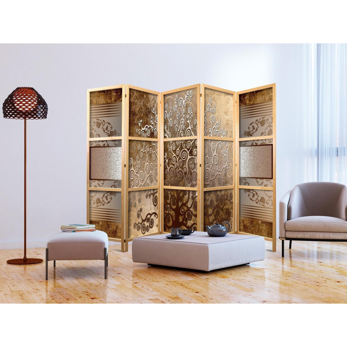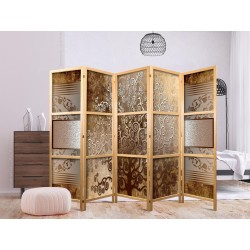 Japanischer Paravent "Japanischer Paravent - Golden Flourishes II" Liegen Ihnen der japanische Stil und die japanische Kultur am Herzen? Aber nicht nahe genug, um dort zu leben oder diesen Teil der Welt zu besuchen? Sind Sie auf der Suche nach einer modernen Dekoration für Ihr Zuhause? Sehen Sie sich die japanischen Paravents an. Dieses vergessene dekorative Element ist sowohl zu Hause als auch im Büro sehr nützlich. Für wenig Geld können Sie Ihre Wohnung fast wie neu einrichten. Japanische Paravents fügen sich perfekt in jeden Einrichtungsstil ein. Ein Paravent "Japanischer Paravent - Golden Flourishes II" ist nicht nur eine tolle Dekorationsidee, sondern auch eine praktische Möglichkeit, für Privatsphäre zu sorgen. Müssen Sie aus Ihrem Wohnzimmer zwei Räume machen? Ein japanischer Paravent ist in einem solchen Fall die ideale Lösung. Darüber hinaus unterstreicht das einseitig aufgedruckte Motiv mit Bezug zu Japan Ihr Interesse an der orientalischen Kultur. Wenn Sie in einer Einzimmerwohnung leben, ist japanischer Paravent eine gute Lösung, um die verschiedenen Bereiche voneinander zu trennen. Auf diese Weise schaffen Sie definierte Bereiche für das Esszimmer oder das Wohnzimmer oder sogar trennen Ihre Home-Office-Ecke ab und nutzen ein schönes Objekt, das viel Charme in Ihr Interieur bringt.