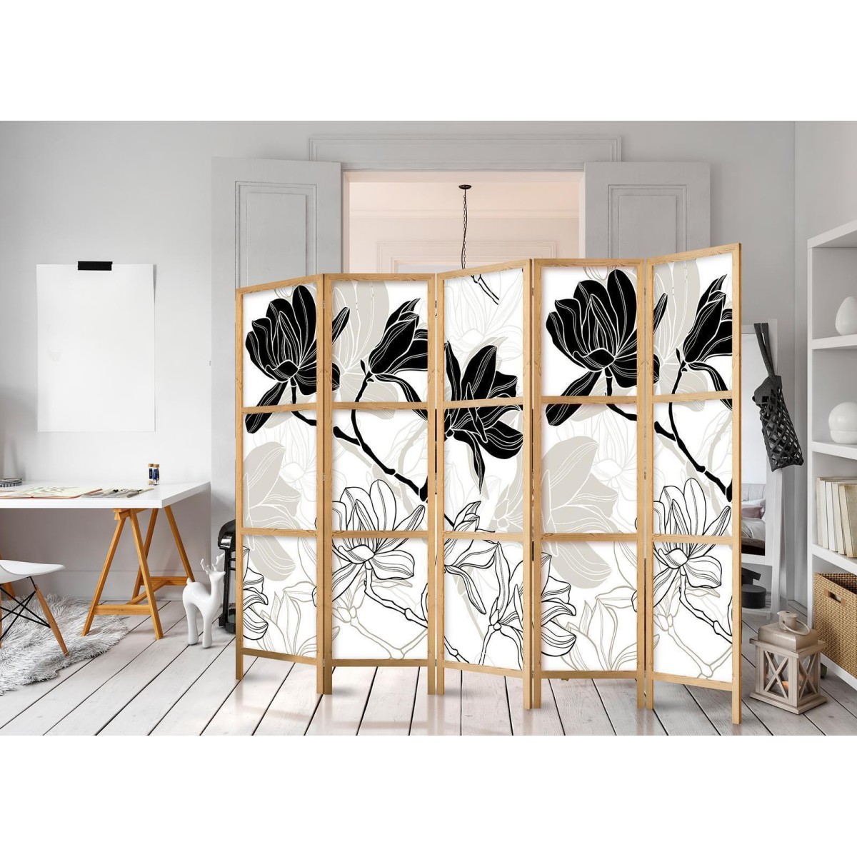Japanischer Paravent "Japanischer Paravent - Black and White Flowers II" Liegen Ihnen der japanische Stil und die japanische Kultur am Herzen? Aber nicht nahe genug, um dort zu leben oder diesen Teil der Welt zu besuchen? Sind Sie auf der Suche nach einer modernen Dekoration für Ihr Zuhause? Sehen Sie sich die japanischen Paravents an. Dieses vergessene dekorative Element ist sowohl zu Hause als auch im Büro sehr nützlich. Für wenig Geld können Sie Ihre Wohnung fast wie neu einrichten. Japanische Paravents fügen sich perfekt in jeden Einrichtungsstil ein. Ein Paravent "Japanischer Paravent - Black and White Flowers II" ist nicht nur eine tolle Dekorationsidee, sondern auch eine praktische Möglichkeit, für Privatsphäre zu sorgen. Müssen Sie aus Ihrem Wohnzimmer zwei Räume machen? Ein japanischer Paravent ist in einem solchen Fall die ideale Lösung. Darüber hinaus unterstreicht das einseitig aufgedruckte Motiv mit Bezug zu Japan Ihr Interesse an der orientalischen Kultur. Wenn Sie in einer Einzimmerwohnung leben, ist japanischer Paravent eine gute Lösung, um die verschiedenen Bereiche voneinander zu trennen. Auf diese Weise schaffen Sie definierte Bereiche für das Esszimmer oder das Wohnzimmer oder sogar trennen Ihre Home-Office-Ecke ab und nutzen ein schönes Objekt, das viel Charme in Ihr Interieur bringt.