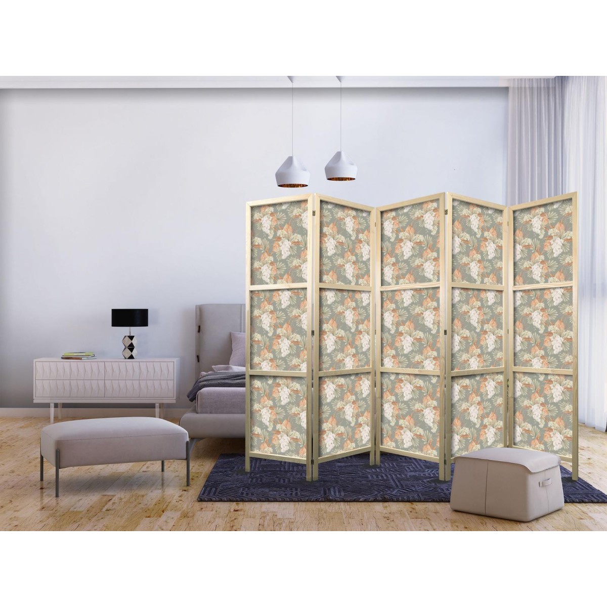 Japanischer Paravent "Japanischer Paravent - Little Bouquets - Exotic Flowers and Leaves on a Gray-Green Background" Liegen Ihnen der japanische Stil und die japanische Kultur am Herzen? Aber nicht nahe genug, um dort zu leben oder diesen Teil der Welt zu besuchen? Sind Sie auf der Suche nach einer modernen Dekoration für Ihr Zuhause? Sehen Sie sich die japanischen Paravents an. Dieses vergessene dekorative Element ist sowohl zu Hause als auch im Büro sehr nützlich. Für wenig Geld können Sie Ihre Wohnung fast wie neu einrichten. Japanische Paravents fügen sich perfekt in jeden Einrichtungsstil ein. Ein Paravent "Japanischer Paravent - Little Bouquets - Exotic Flowers and Leaves on a Gray-Green Background" ist nicht nur eine tolle Dekorationsidee, sondern auch eine praktische Möglichkeit, für Privatsphäre zu sorgen. Müssen Sie aus Ihrem Wohnzimmer zwei Räume machen? Ein japanischer Paravent ist in einem solchen Fall die ideale Lösung. Darüber hinaus unterstreicht das einseitig aufgedruckte Motiv mit Bezug zu Japan Ihr Interesse an der orientalischen Kultur. Wenn Sie in einer Einzimmerwohnung leben, ist japanischer Paravent eine gute Lösung, um die verschiedenen Bereiche voneinander zu trennen. Auf diese Weise schaffen Sie definierte Bereiche für das Esszimmer oder das Wohnzimmer oder sogar trennen Ihre Home-Office-Ecke ab und nutzen ein schönes Objekt, das viel Charme in Ihr Interieur bringt.