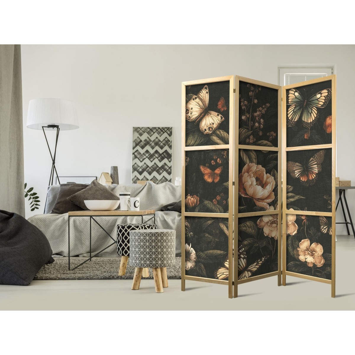 Japanischer Paravent "Japanischer Paravent - Mysterious Garden - Butterflies Flying Over Flowers - Rustic Evening" Liegen Ihnen der japanische Stil und die japanische Kultur am Herzen? Aber nicht nahe genug, um dort zu leben oder diesen Teil der Welt zu besuchen? Sind Sie auf der Suche nach einer modernen Dekoration für Ihr Zuhause? Sehen Sie sich die japanischen Paravents an. Dieses vergessene dekorative Element ist sowohl zu Hause als auch im Büro sehr nützlich. Für wenig Geld können Sie Ihre Wohnung fast wie neu einrichten. Japanische Paravents fügen sich perfekt in jeden Einrichtungsstil ein. Ein Paravent "Japanischer Paravent - Mysterious Garden - Butterflies Flying Over Flowers - Rustic Evening" ist nicht nur eine tolle Dekorationsidee, sondern auch eine praktische Möglichkeit, für Privatsphäre zu sorgen. Müssen Sie aus Ihrem Wohnzimmer zwei Räume machen? Ein japanischer Paravent ist in einem solchen Fall die ideale Lösung. Darüber hinaus unterstreicht das einseitig aufgedruckte Motiv mit Bezug zu Japan Ihr Interesse an der orientalischen Kultur. Wenn Sie in einer Einzimmerwohnung leben, ist japanischer Paravent eine gute Lösung, um die verschiedenen Bereiche voneinander zu trennen. Auf diese Weise schaffen Sie definierte Bereiche für das Esszimmer oder das Wohnzimmer oder sogar trennen Ihre Home-Office-Ecke ab und nutzen ein schönes Objekt, das viel Charme in Ihr Interieur bringt.
