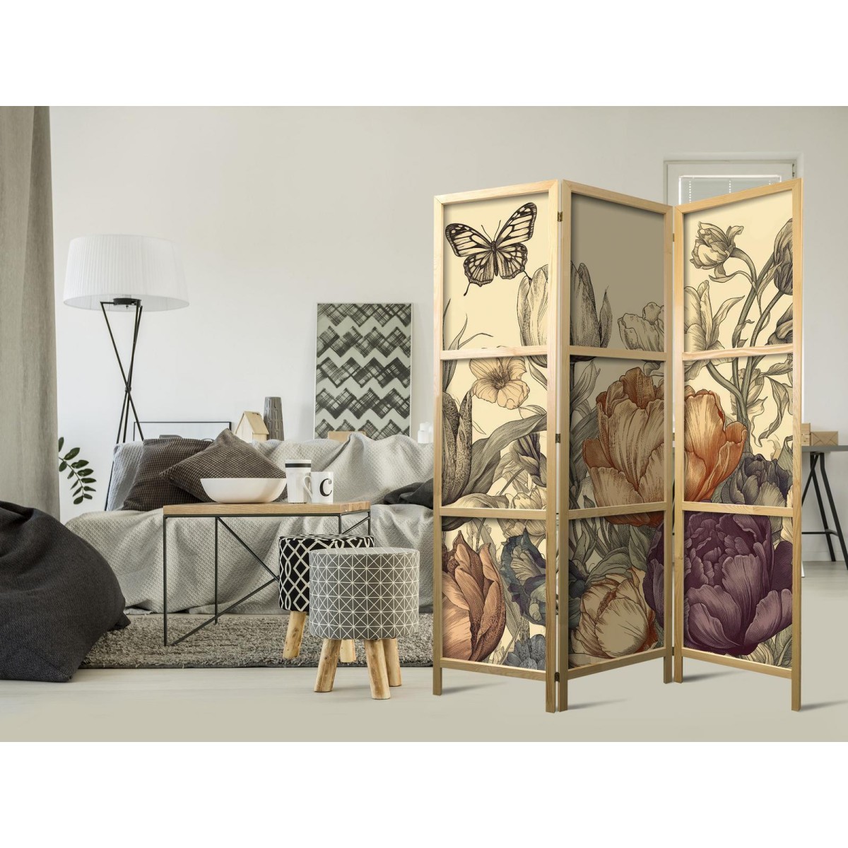 Japanischer Paravent "Japanischer Paravent - Tulips in Cream - Illustration of Flowers and Butterflies on a Light Background" Liegen Ihnen der japanische Stil und die japanische Kultur am Herzen? Aber nicht nahe genug, um dort zu leben oder diesen Teil der Welt zu besuchen? Sind Sie auf der Suche nach einer modernen Dekoration für Ihr Zuhause? Sehen Sie sich die japanischen Paravents an. Dieses vergessene dekorative Element ist sowohl zu Hause als auch im Büro sehr nützlich. Für wenig Geld können Sie Ihre Wohnung fast wie neu einrichten. Japanische Paravents fügen sich perfekt in jeden Einrichtungsstil ein. Ein Paravent "Japanischer Paravent - Tulips in Cream - Illustration of Flowers and Butterflies on a Light Background" ist nicht nur eine tolle Dekorationsidee, sondern auch eine praktische Möglichkeit, für Privatsphäre zu sorgen. Müssen Sie aus Ihrem Wohnzimmer zwei Räume machen? Ein japanischer Paravent ist in einem solchen Fall die ideale Lösung. Darüber hinaus unterstreicht das einseitig aufgedruckte Motiv mit Bezug zu Japan Ihr Interesse an der orientalischen Kultur. Wenn Sie in einer Einzimmerwohnung leben, ist japanischer Paravent eine gute Lösung, um die verschiedenen Bereiche voneinander zu trennen. Auf diese Weise schaffen Sie definierte Bereiche für das Esszimmer oder das Wohnzimmer oder sogar trennen Ihre Home-Office-Ecke ab und nutzen ein schönes Objekt, das viel Charme in Ihr Interieur bringt.
