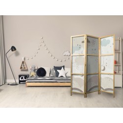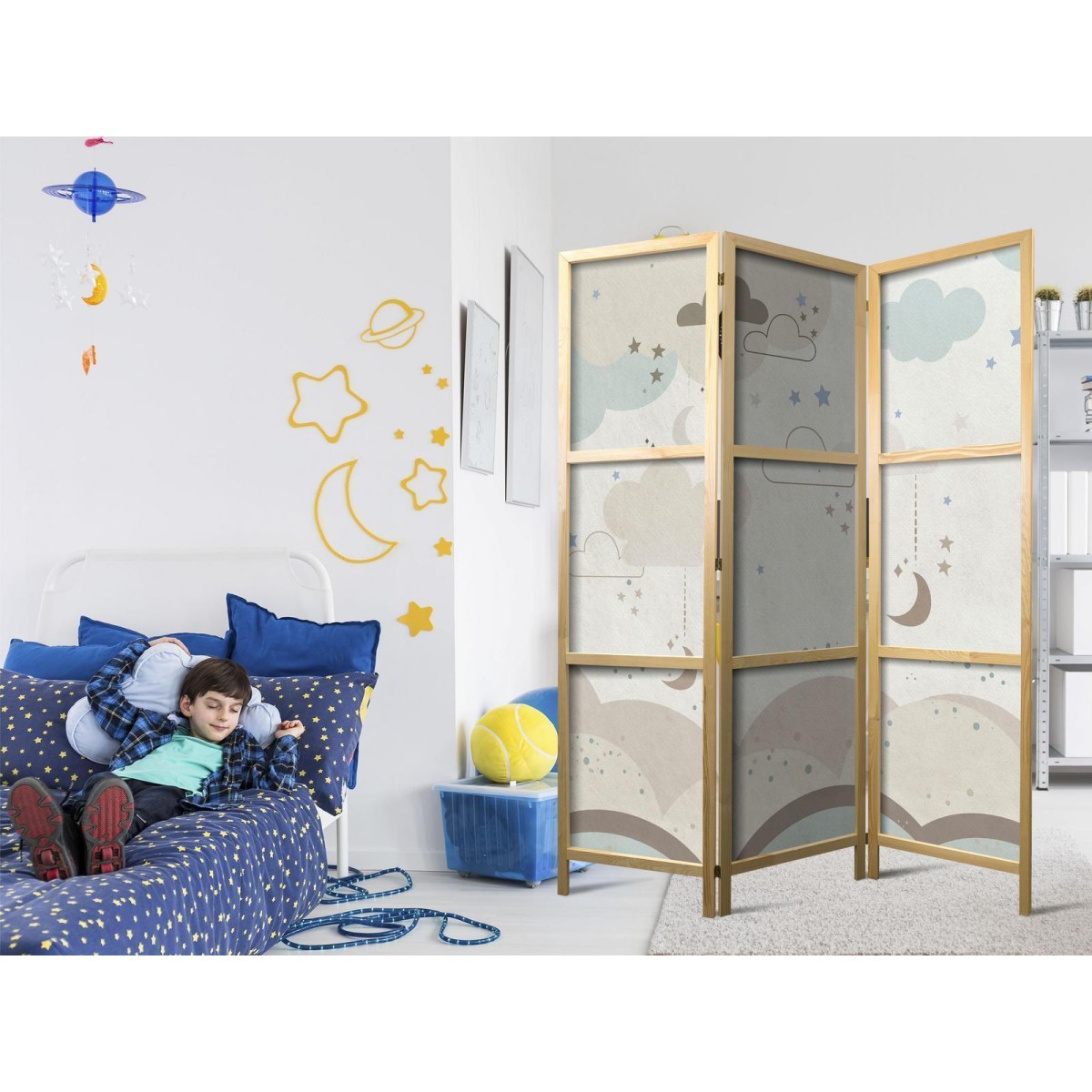 Paravent "Japanischer Paravent - Cloudy Night Sky - Moons in browns and beiges among numerous clouds and stars on a light background." ist nicht nur eine tolle Dekorationsidee, sondern auch eine praktische Möglichkeit, für Privatsphäre zu sorgen. Müssen Sie aus Ihrem Wohnzimmer zwei Räume machen? Ein