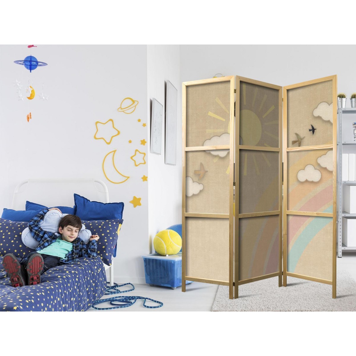 Japanisches Paravent "Japanischer Paravent - Holiday Sky - A Rainbow on a Sunny Day and Flying Birds." ist auch eine gute Option für Schönheitssalons. Wenn Sie keine Wände bauen wollen, deren Layout Sie nach einer gewissen Zeit langweilen könnte, ist ein japanischer