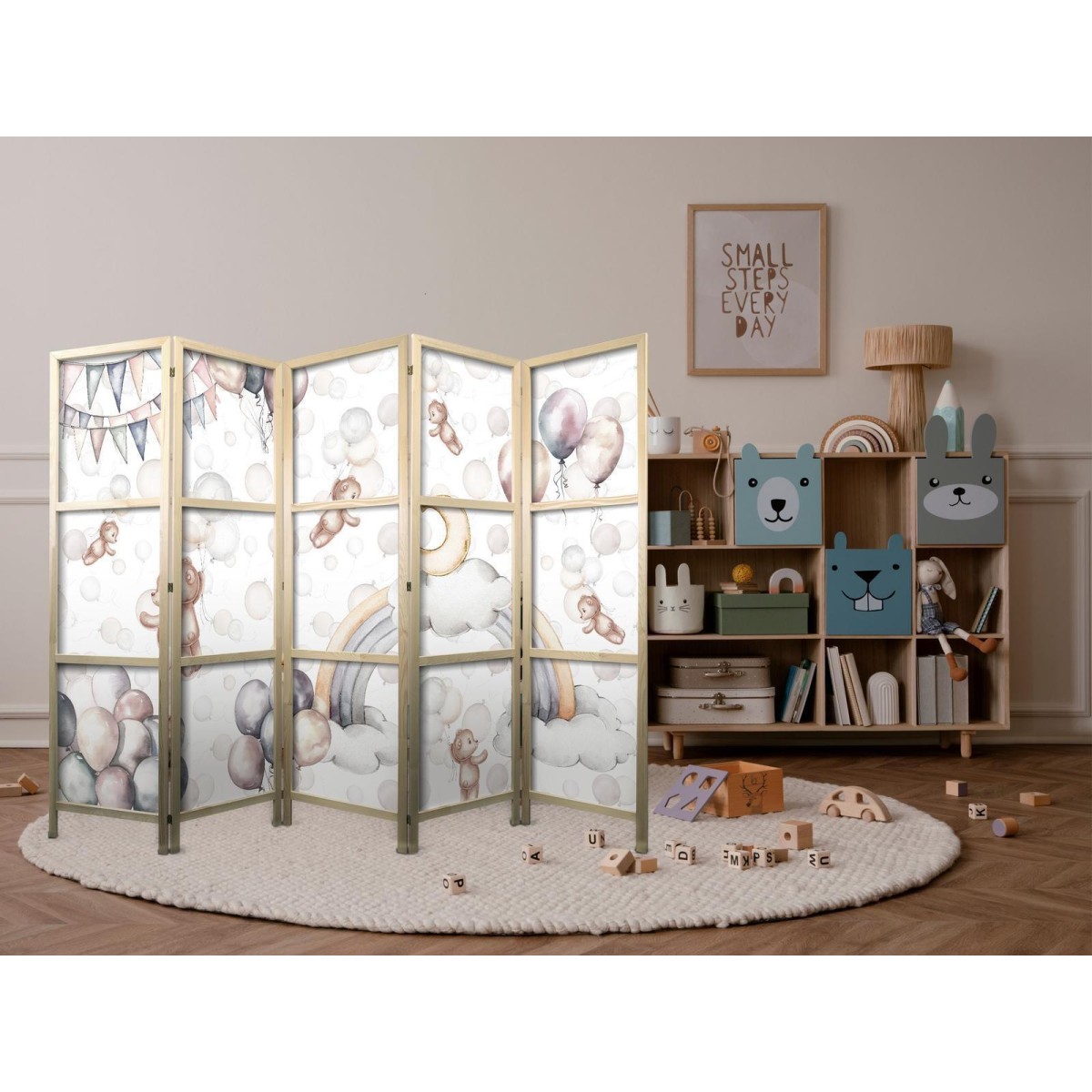 Asiatische Paravents Die asiatischen Paravents aus unserer Kollektion werden auf hochwertiges Vlies gedruckt. Dank des Materials hat sich der sichere Paravent auch im Zimmer eines jungen Orient-Liebhaber bewährt. Asiatische Paravents sind perfekt für ein Restaurant in diesem Stil. Sie können die Bereiche zwischen den Tischen abgrenzen, so dass sich die Gäste wohlfühlen. Japanisches Paravent "Japanischer Paravent - Plush Bears with Balloons - Flying light-brown bears among balloons - clouds - and rainbows in subdued - pastel colors." ist auch eine gute Option für Schönheitssalons. Wenn Sie keine Wände bauen wollen, deren Layout Sie nach einer gewissen Zeit langweilen könnte, ist ein japanischer Paravent ideal für Sie! Es trennt die Kundenbereiche und verleiht ihnen Intimität.