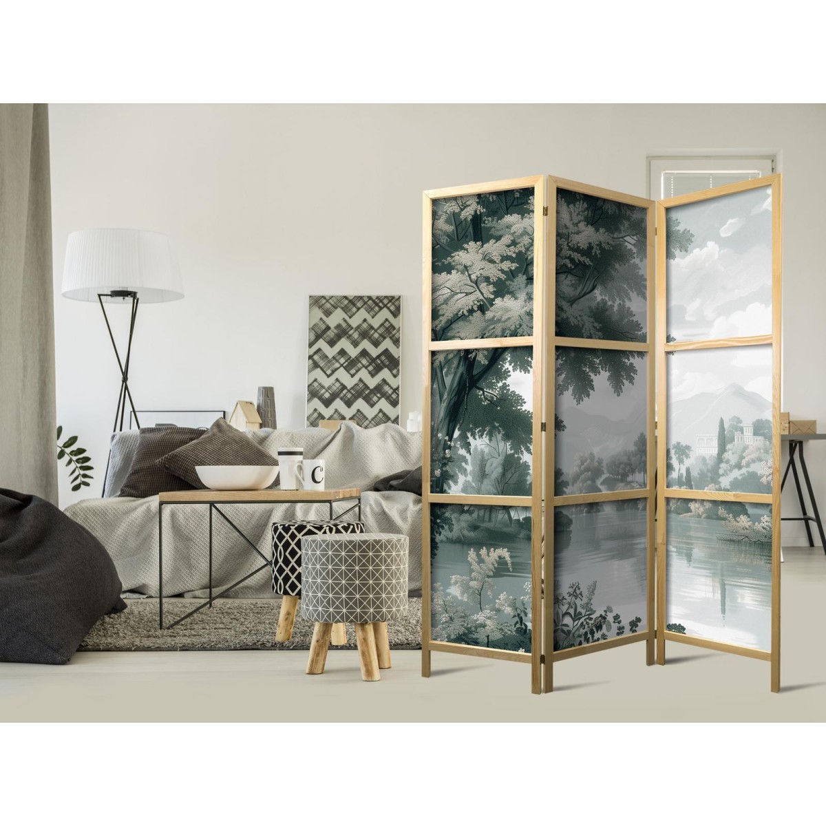 Japanischer Paravent "Japanischer Paravent - View of the Park and Lake - Retro Vintage Landscape in Greens." Liegen Ihnen der japanische Stil und die japanische Kultur am Herzen? Aber nicht nahe genug, um dort zu leben oder diesen Teil der Welt zu besuchen? Sind Sie auf der Suche nach einer modernen Dekoration für Ihr Zuhause? Sehen Sie sich die japanischen Paravents an. Dieses vergessene dekorative Element ist sowohl zu Hause als auch im Büro sehr nützlich. Für wenig Geld können Sie Ihre Wohnung fast wie neu einrichten. Japanische Paravents fügen sich perfekt in jeden Einrichtungsstil ein. Ein Paravent "Japanischer Paravent - View of the Park and Lake - Retro Vintage Landscape in Greens." ist nicht nur eine tolle Dekorationsidee, sondern auch eine praktische Möglichkeit, für Privatsphäre zu sorgen. Müssen Sie aus Ihrem Wohnzimmer zwei Räume machen? Ein japanischer Paravent ist in einem solchen Fall die ideale Lösung. Darüber hinaus unterstreicht das einseitig aufgedruckte Motiv mit Bezug zu Japan Ihr Interesse an der orientalischen Kultur. Wenn Sie in einer Einzimmerwohnung leben, ist japanischer Paravent eine gute Lösung, um die verschiedenen Bereiche voneinander zu trennen. Auf diese Weise schaffen Sie definierte Bereiche für das Esszimmer oder das Wohnzimmer oder sogar trennen Ihre Home-Office-Ecke ab und nutzen ein schönes Objekt, das viel Charme in Ihr Interieur bringt.