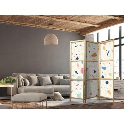 Japanischer Paravent "Japanischer Paravent - Terrazzo with Multicolored - Large Elements - Cheerful Pattern on a Light Background." Liegen Ihnen der japanische Stil und die japanische Kultur am Herzen? Aber nicht nahe genug, um dort zu leben oder diesen Teil der Welt zu besuchen? Sind Sie auf der Suche nach einer modernen Dekoration für Ihr Zuhause? Sehen Sie sich die japanischen Paravents an. Dieses vergessene dekorative Element ist sowohl zu Hause als auch im Büro sehr nützlich. Für wenig Geld können Sie Ihre Wohnung fast wie neu einrichten. Japanische Paravents fügen sich perfekt in jeden Einrichtungsstil ein. Ein Paravent "Japanischer Paravent - Terrazzo with Multicolored - Large Elements - Cheerful Pattern on a Light Background." ist nicht nur eine tolle Dekorationsidee, sondern auch eine praktische Möglichkeit, für Privatsphäre zu sorgen. Müssen Sie aus Ihrem Wohnzimmer zwei Räume machen? Ein japanischer Paravent ist in einem solchen Fall die ideale Lösung. Darüber hinaus unterstreicht das einseitig aufgedruckte Motiv mit Bezug zu Japan Ihr Interesse an der orientalischen Kultur. Wenn Sie in einer Einzimmerwohnung leben, ist japanischer Paravent eine gute Lösung, um die verschiedenen Bereiche voneinander zu trennen. Auf diese Weise schaffen Sie definierte Bereiche für das Esszimmer oder das Wohnzimmer oder sogar trennen Ihre Home-Office-Ecke ab und nutzen ein schönes Objekt, das viel Charme in Ihr Interieur bringt.