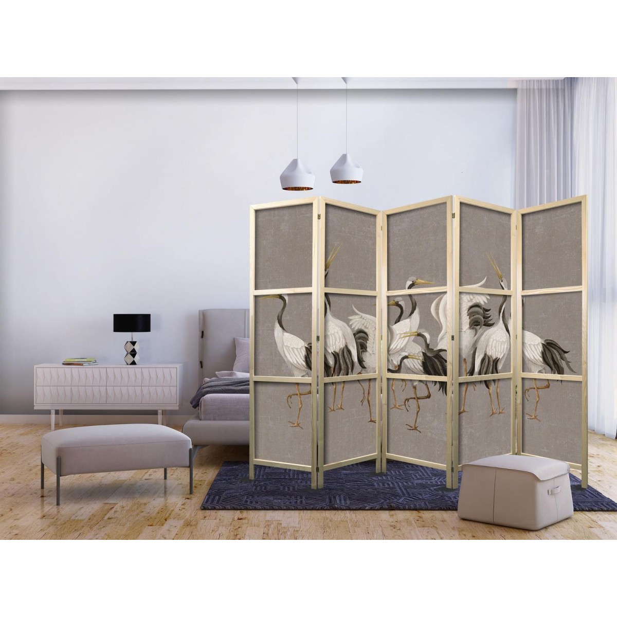 Japanischer Paravent - Crane dance - bright silhouettes of birds on a warm grey background with texture