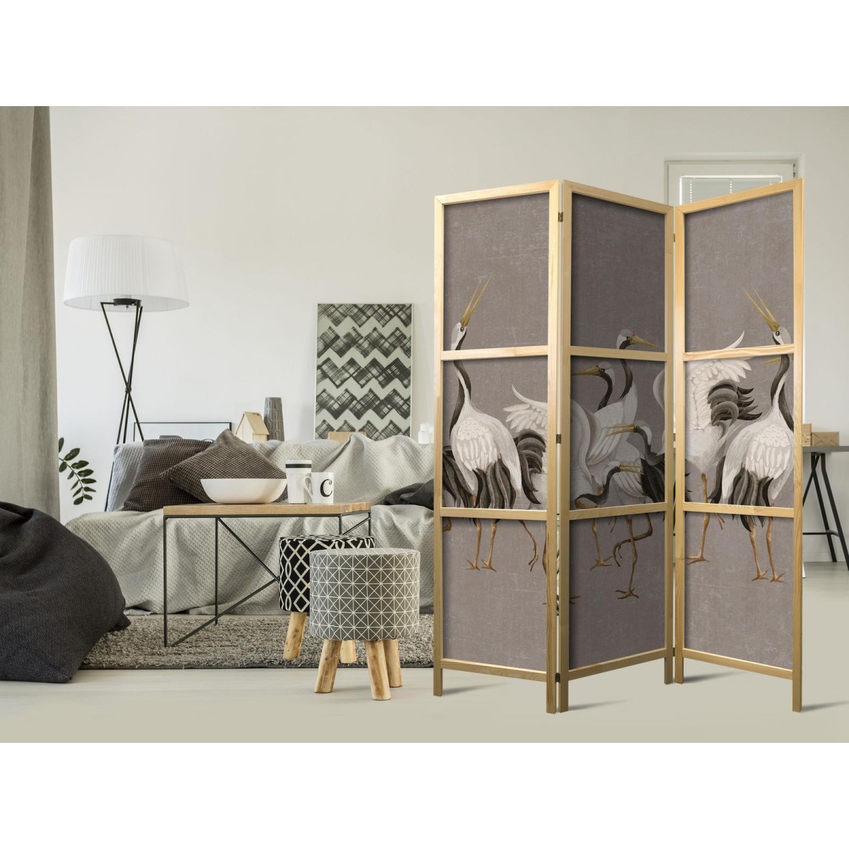 Japanischer Paravent "Japanischer Paravent - Crane dance - bright silhouettes of birds on a warm grey background with texture" Liegen Ihnen der japanische Stil und die japanische Kultur am Herzen? Aber nicht nahe genug, um dort zu leben oder diesen Teil der Welt zu besuchen? Sind Sie auf der Suche nach einer modernen Dekoration für Ihr Zuhause? Sehen Sie sich die japanischen Paravents an. Dieses vergessene dekorative Element ist sowohl zu Hause als auch im Büro sehr nützlich. Für wenig Geld können Sie Ihre Wohnung fast wie neu einrichten. Japanische Paravents fügen sich perfekt in jeden Einrichtungsstil ein. Ein Paravent "Japanischer Paravent - Crane dance - bright silhouettes of birds on a warm grey background with texture" ist nicht nur eine tolle Dekorationsidee, sondern auch eine praktische Möglichkeit, für Privatsphäre zu sorgen. Müssen Sie aus Ihrem Wohnzimmer zwei Räume machen? Ein japanischer Paravent ist in einem solchen Fall die ideale Lösung. Darüber hinaus unterstreicht das einseitig aufgedruckte Motiv mit Bezug zu Japan Ihr Interesse an der orientalischen Kultur. Wenn Sie in einer Einzimmerwohnung leben, ist japanischer Paravent eine gute Lösung, um die verschiedenen Bereiche voneinander zu trennen. Auf diese Weise schaffen Sie definierte Bereiche für das Esszimmer oder das Wohnzimmer oder sogar trennen Ihre Home-Office-Ecke ab und nutzen ein schönes Objekt, das viel Charme in Ihr Interieur bringt.