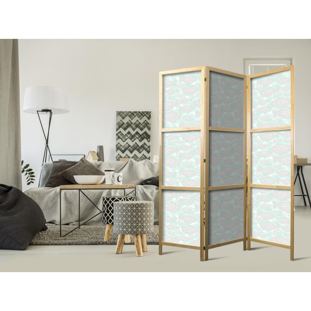 Paravent "Japanischer Paravent - Minimalist Fish - Fish from Gray Dots on the Crystal Clear Water Surface in Mint Green" ist nicht nur eine tolle Dekorationsidee, sondern auch eine praktische Möglichkeit, für Privatsphäre zu sorgen. Müssen Sie aus Ihrem Wohnzimmer zwei Räume machen? Ein