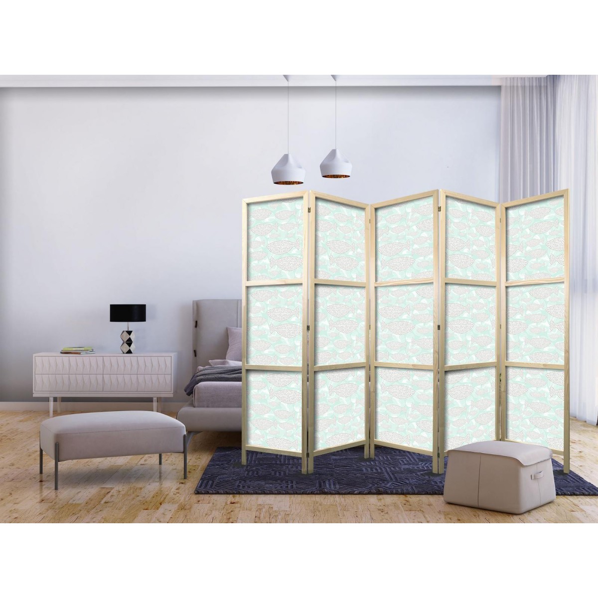 Asiatische Paravents Die asiatischen Paravents aus unserer Kollektion werden auf hochwertiges Vlies gedruckt. Dank des Materials hat sich der sichere Paravent auch im Zimmer eines jungen Orient-Liebhaber bewährt. Asiatische Paravents sind perfekt für ein Restaurant in diesem Stil. Sie können die Bereiche zwischen den Tischen abgrenzen, so dass sich die Gäste wohlfühlen. Japanisches Paravent "Japanischer Paravent - Minimalist Fish - Fishes From Grey Dots Against a Crystal Sheet of Water in Mint Green Colors" ist auch eine gute Option für Schönheitssalons. Wenn Sie keine Wände bauen wollen, deren Layout Sie nach einer gewissen Zeit langweilen könnte, ist ein japanischer Paravent ideal für Sie! Es trennt die Kundenbereiche und verleiht ihnen Intimität.