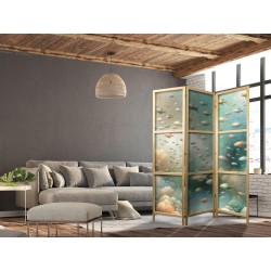 Asiatische Paravents Die asiatischen Paravents aus unserer Kollektion werden auf hochwertiges Vlies gedruckt. Dank des Materials hat sich der sichere Paravent auch im Zimmer eines jungen Orient-Liebhaber bewährt. Asiatische Paravents sind perfekt für ein Restaurant in diesem Stil. Sie können die Bereiche zwischen den Tischen abgrenzen, so dass sich die Gäste wohlfühlen. Japanisches Paravent "Japanischer Paravent - Spectacular Underwater Landscape - Fish in the Underwater World in Colors of Turquoise Blue Beige and Delicate Orange" ist auch eine gute Option für Schönheitssalons. Wenn Sie keine Wände bauen wollen, deren Layout Sie nach einer gewissen Zeit langweilen könnte, ist ein japanischer Paravent ideal für Sie! Es trennt die Kundenbereiche und verleiht ihnen Intimität.