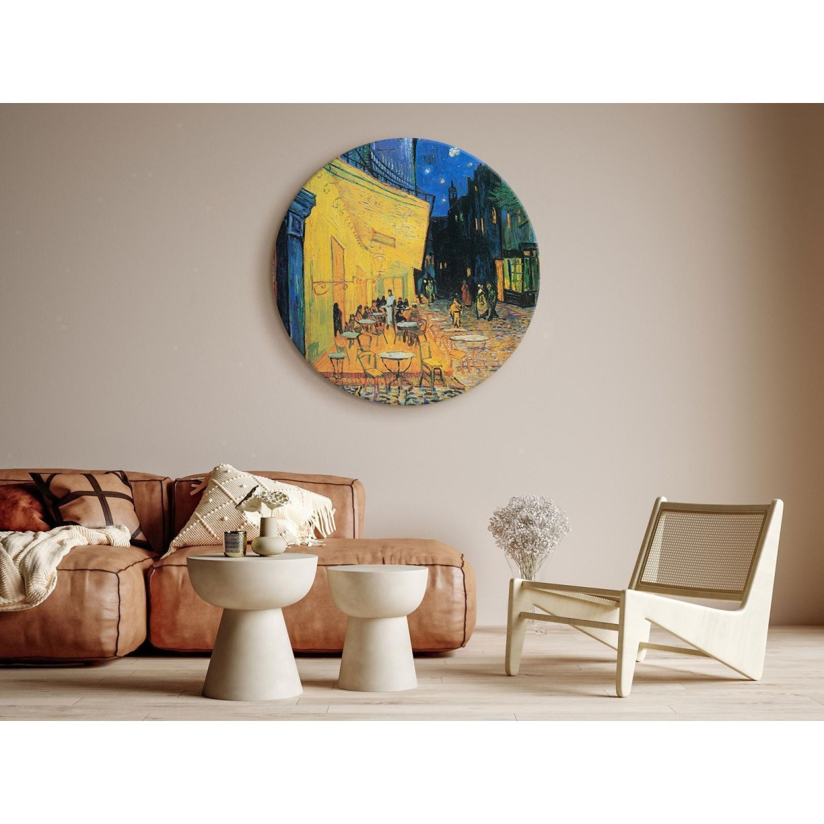 runde Bild auf Leinwand "Rundes Bild - Vincent Van Gogh – Café Terrace at Night" ist eine moderne Dekoration, die perfekt zu den neuesten Einrichtungstrends passt und sowohl traditionell eingerichtete Räume als auch moderne Wohnungen und Büros bereichert. Eine Metamorphose ist im Gange! Egal, ob Sie Ihr Zuhause - ein Wohnzimmer, Schlafzimmer, Arbeitszimmer oder Jugendzimmer - umgestalten oder ein Büro, einen Warteraum, ein Café, einen Schönheitssalon oder einen anderen öffentlichen Raum dekorieren möchten, ein