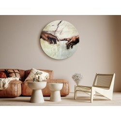 runde Bild auf Leinwand "Rundes Bild - The Creation of Adam – hands from a fresco by Michelangelo" ist eine moderne Dekoration, die perfekt zu den neuesten Einrichtungstrends passt und sowohl traditionell eingerichtete Räume als auch moderne Wohnungen und Büros bereichert. Eine Metamorphose ist im Gange! Egal, ob Sie Ihr Zuhause - ein Wohnzimmer, Schlafzimmer, Arbeitszimmer oder Jugendzimmer - umgestalten oder ein Büro, einen Warteraum, ein Café, einen Schönheitssalon oder einen anderen öffentlichen Raum dekorieren möchten, ein