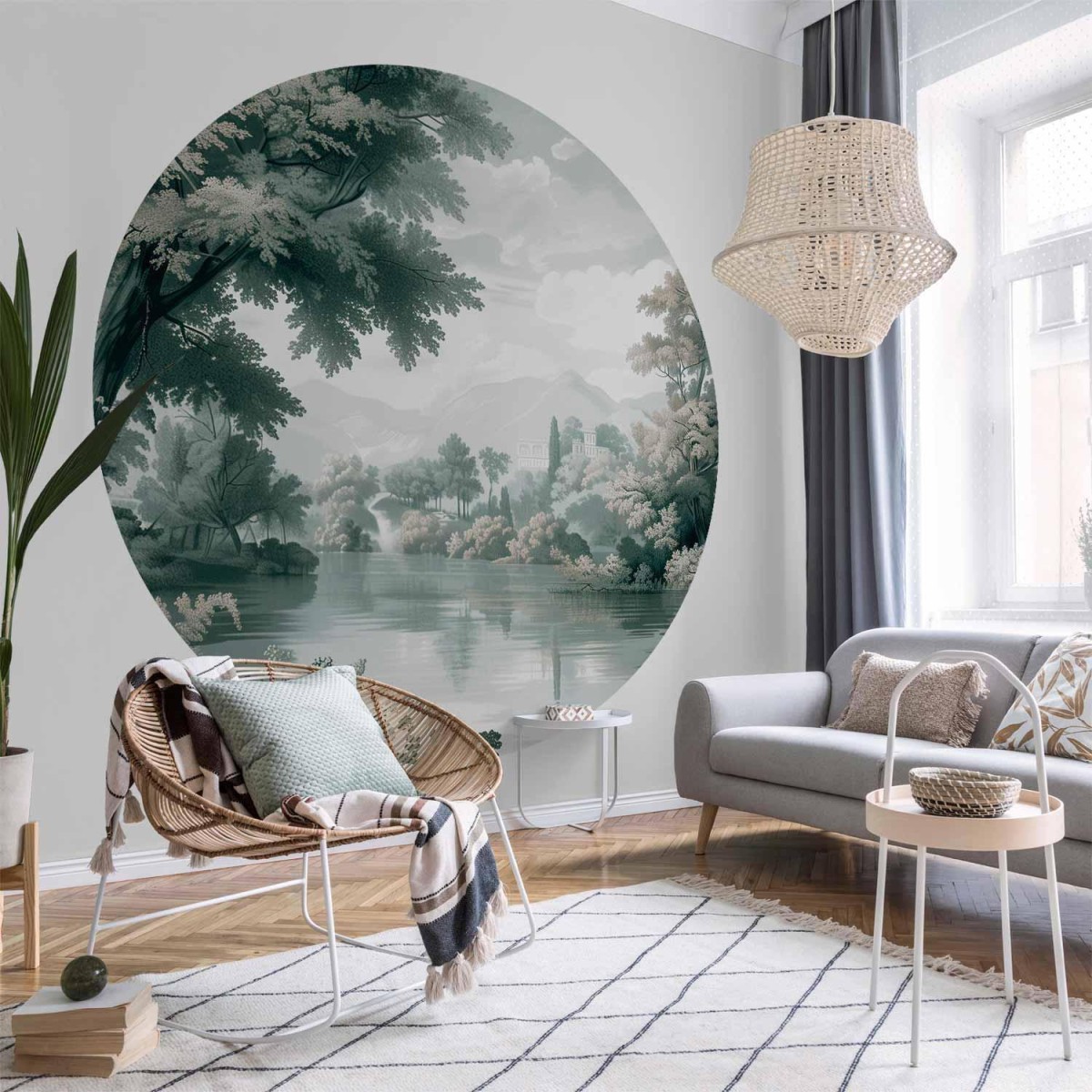 Unsere runden Fototapeten sind selbstklebend, wodurch sie als Wandtattoo oder auf jeder glatten Oberfläche (z. B. Möbel, Nischen, Decke) verwendet werden können. Klebstofffreie Montage erfordert keine Spezialwerkzeuge, die Installation ist schnell und einfach. Schneiden Sie die Tapete einfach mit dem beiliegenden Messer gemäß der mitgelieferten Schablone zu. Dank fortschrittlicher Drucktechnologie bleiben Farben lebendig und Details scharf – über viele Jahre, selbst in sonnendurchfluteten Räumen. Eine breite Auswahl an Mustern und Motiven – von subtilem Minimalismus bis zu farbenreichen Kompositionen – stellt sicher, dass jeder etwas Passendes findet. „Runde Fototapete - Landscape with a park and lake in retro greens” lässt Ihr Interieur im Handumdrehen frischer wirken und verleiht ihm eine neue Dimension. Die runde Fototapete ist eine hervorragende Alternative zu traditionellen Tapeten und ermöglicht kontinuierliches Experimentieren mit der Gestaltung.