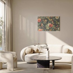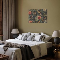 Bilder Wohnzimmer. Dekorieren Sie die Wände in Ihrem privaten Bereich mit einem Bild "Leinwandbild - Flowers, birds and butterflies – vintage-style illustration". Wir empfehlen