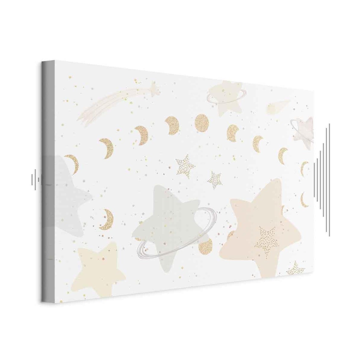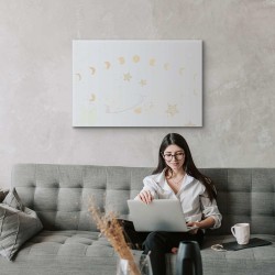 Bilder Wohnzimmer. Dekorieren Sie die Wände in Ihrem privaten Bereich mit einem Bild "Leinwandbild - Fairy-Tale Galaxy - Phases of the Moon in Yellow Tones Among Stars in Beige and Ash Colors with Stardust". Wir empfehlen