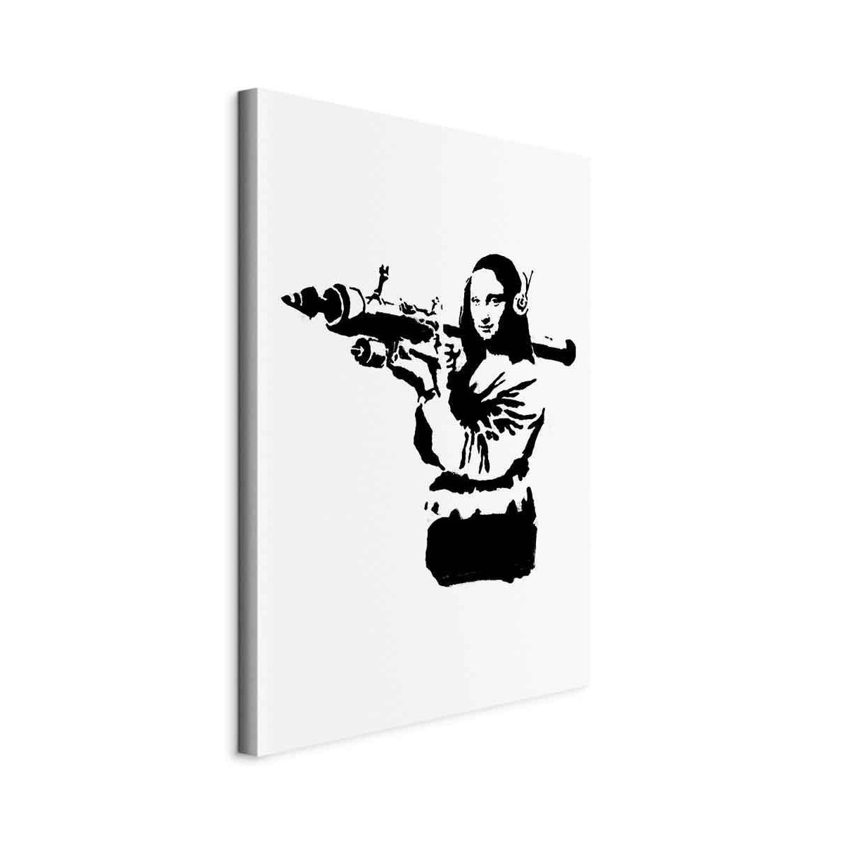 Bilder Wohnzimmer. Dekorieren Sie die Wände in Ihrem privaten Bereich mit einem Bild "Leinwandbild - Banksy Mona Lisa with Rocket Launcher (1 Part) Vertical". Wir empfehlen
