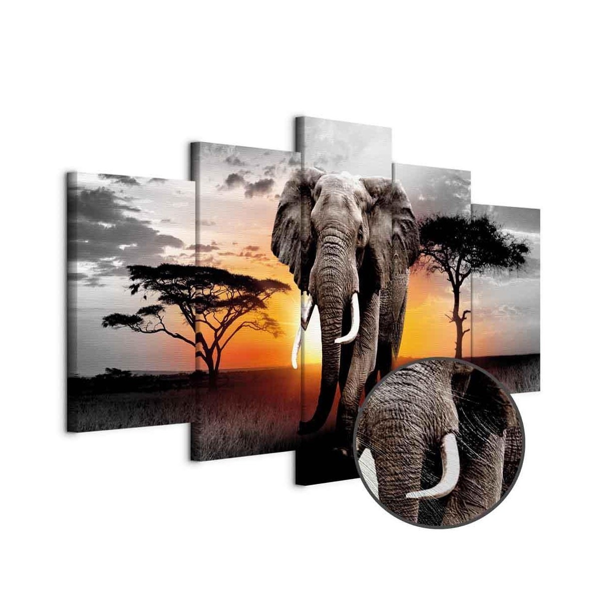 Bilder Wohnzimmer. Dekorieren Sie die Wände in Ihrem privaten Bereich mit einem Bild "Leinwandbild - Elephant at Sunset". Wir empfehlen