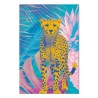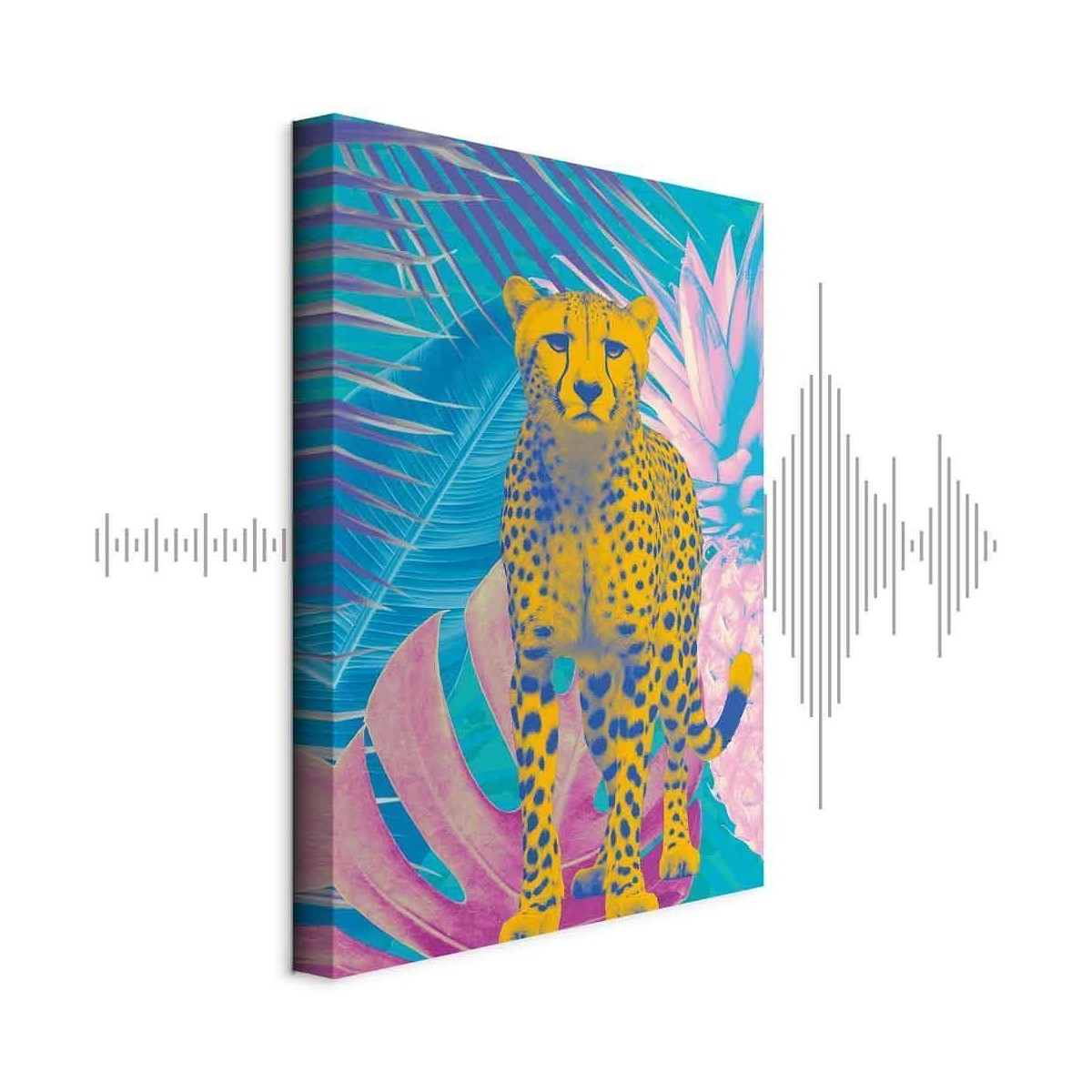 Bilder Wohnzimmer. Dekorieren Sie die Wände in Ihrem privaten Bereich mit einem Bild "Leinwandbild - Exotic Leopard - Colorful Portrait of a Cheetah Against Tropical Leaves". Wir empfehlen